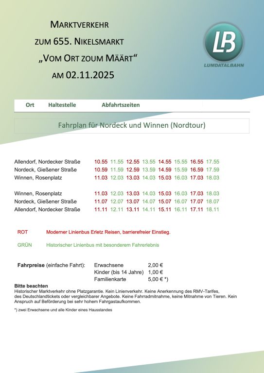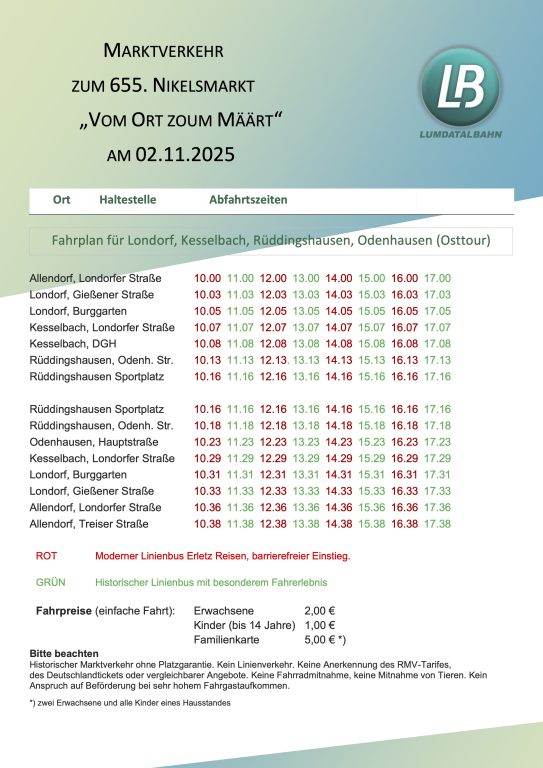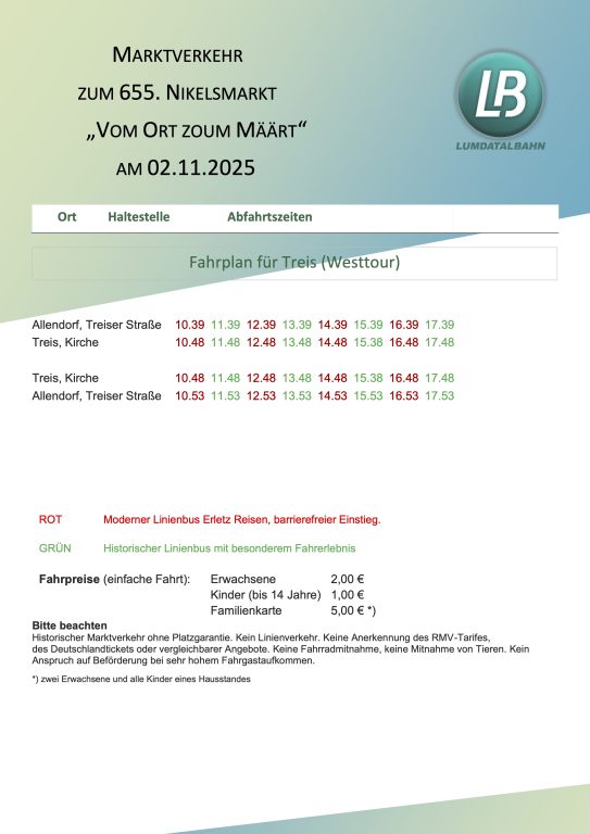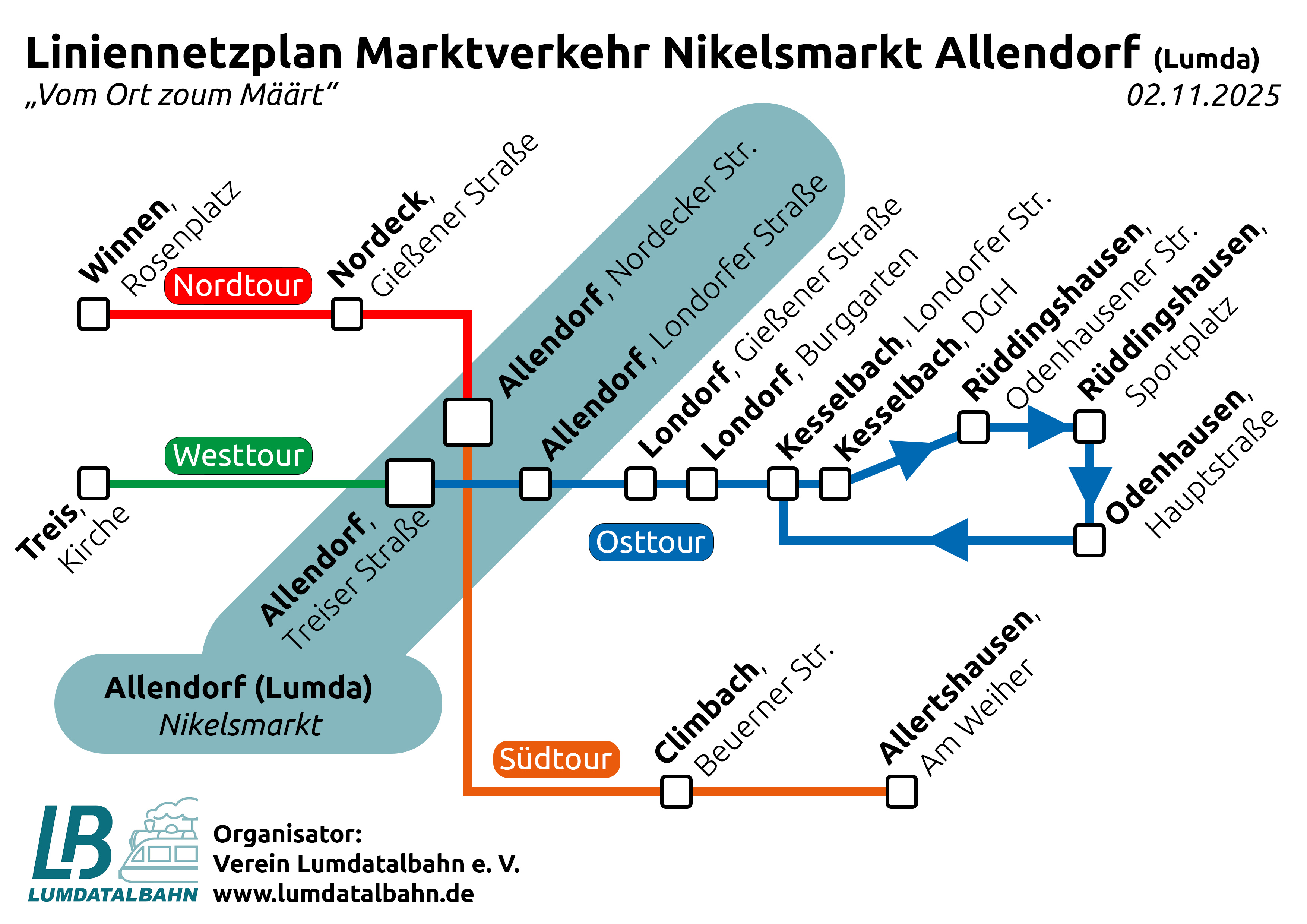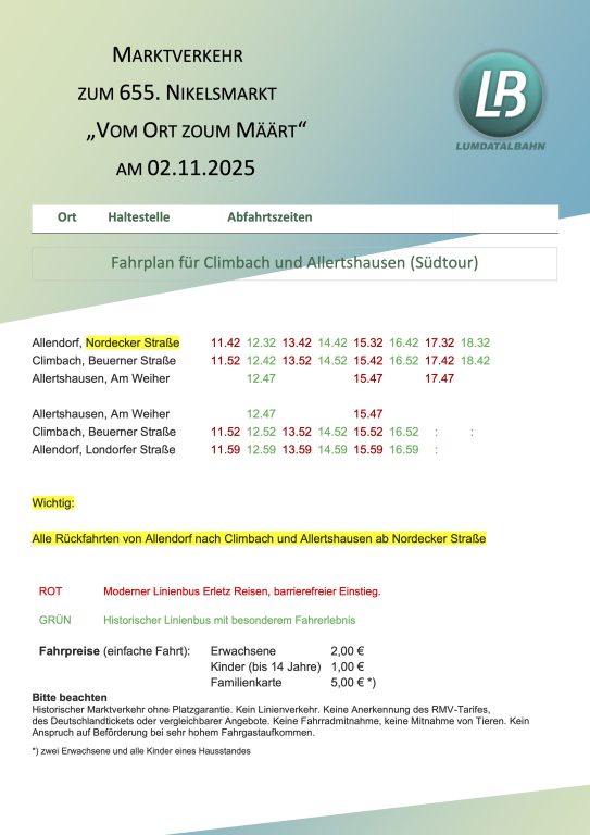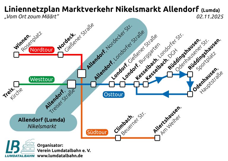Zum Altstadtfest des Nikelsmarktes in Allendorf (Lumda) am Sonntag, den 02.11.2025 gibt es in diesem Jahr besonders viele Verbindungen zur bequemen Anreise erstmals mit noch mehr Haltepunkten, damit noch mehr Besucherinnen und Besucher bequem zum Markt gelangen können. Der Verein Lumdatalbahn e.V. bietet einen Marktverkehr zum günstigen Tarif an, allerdings ohne Anerkennung des Deutschland-Tickets oder von RMV-Fahrscheinen.